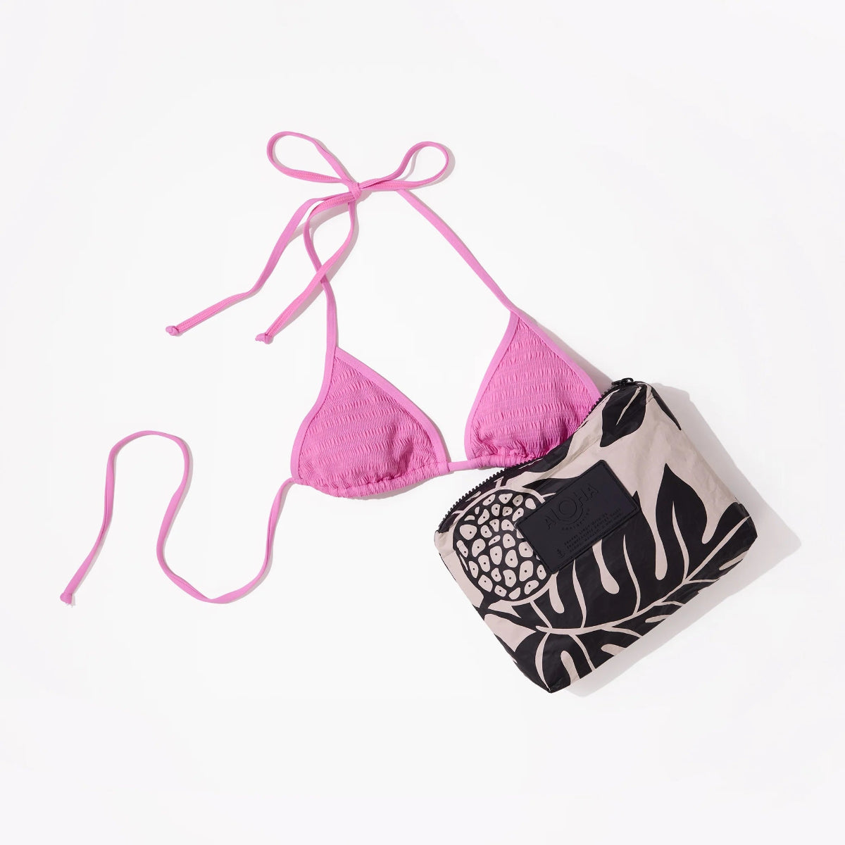 Features a white interior Materials SPLASH-PROOF® is the next best thing to waterproof! Your belongings will be protected from a light splash, light rain, or a cocktail spillage, but please do not submerge your ALOHA Collection pouch with belongings inside. The zipper and seams of ALOHA Collection bags are not watertight.