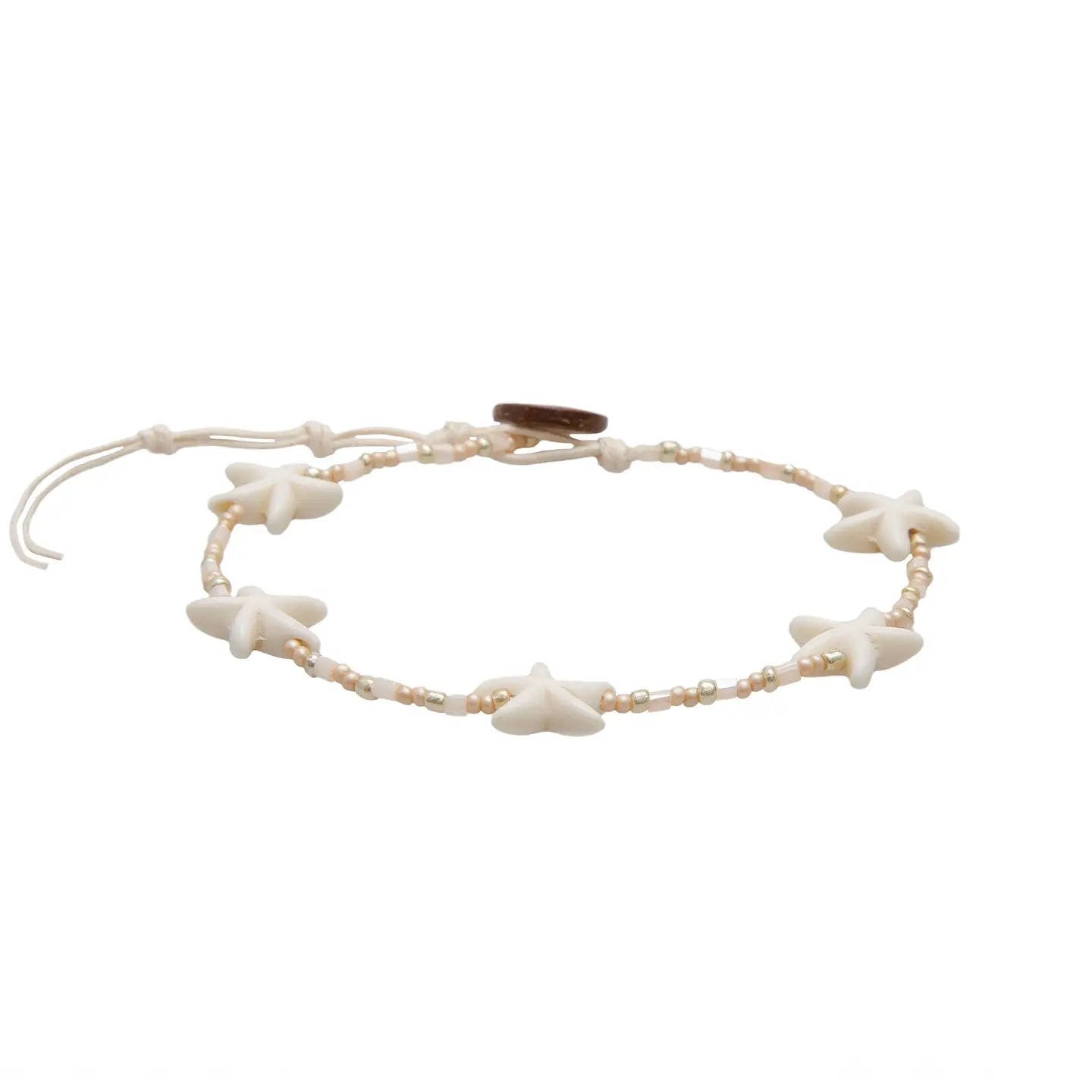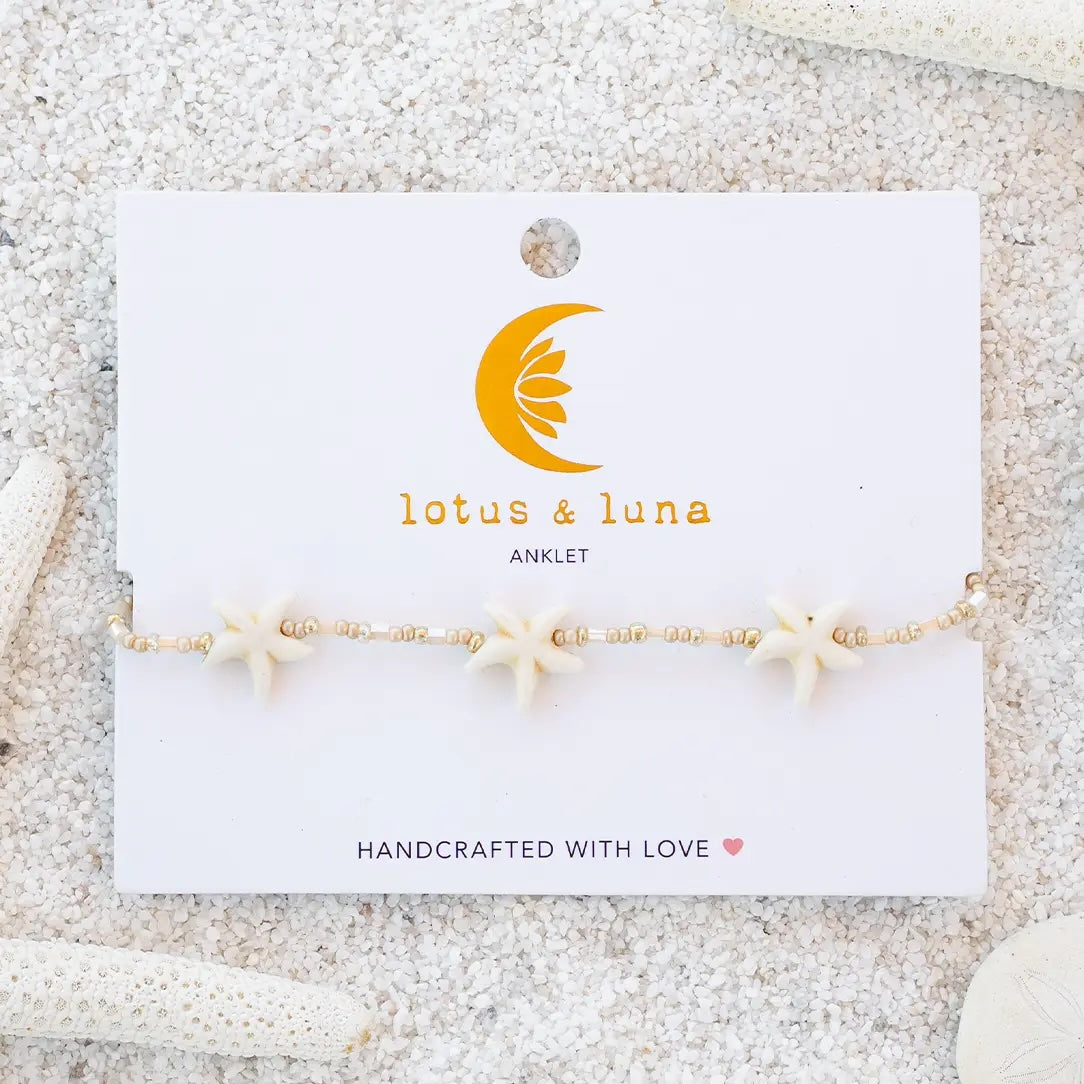Dance into island dreams with our whimsical Lotus & Luna Sandy Starfish Anklet! Handcrafted with tiny, shimmering seed beads, smooth tube beads, and a natural cotton cord, this anklet features charming starfish beads and a sweet coconut button closure. It's a playful whisper of sun-kissed beaches and ocean magic, ready to adorn your steps with joyful, carefree vibes.