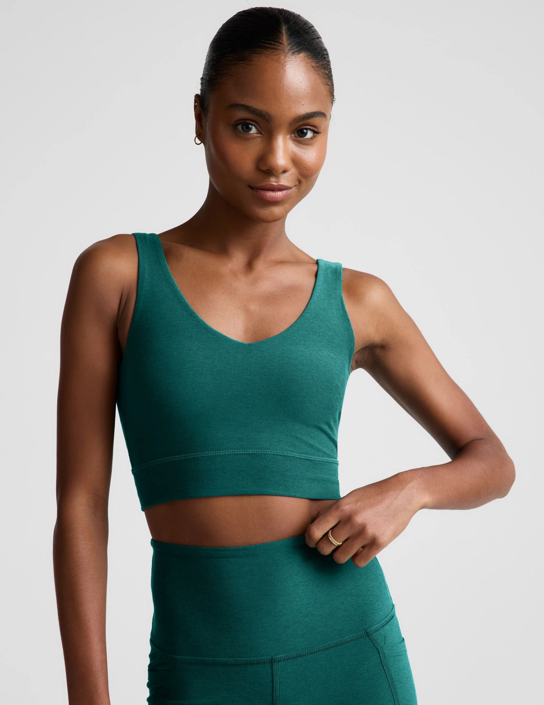 It's always a good day to have a good day. Especially in our new deep V-neck Good Day Long Line Bra. Design details include a front and back V-neck, a comfortable built-in bra, and the signature softness of their bestselling Spacedye fabric.