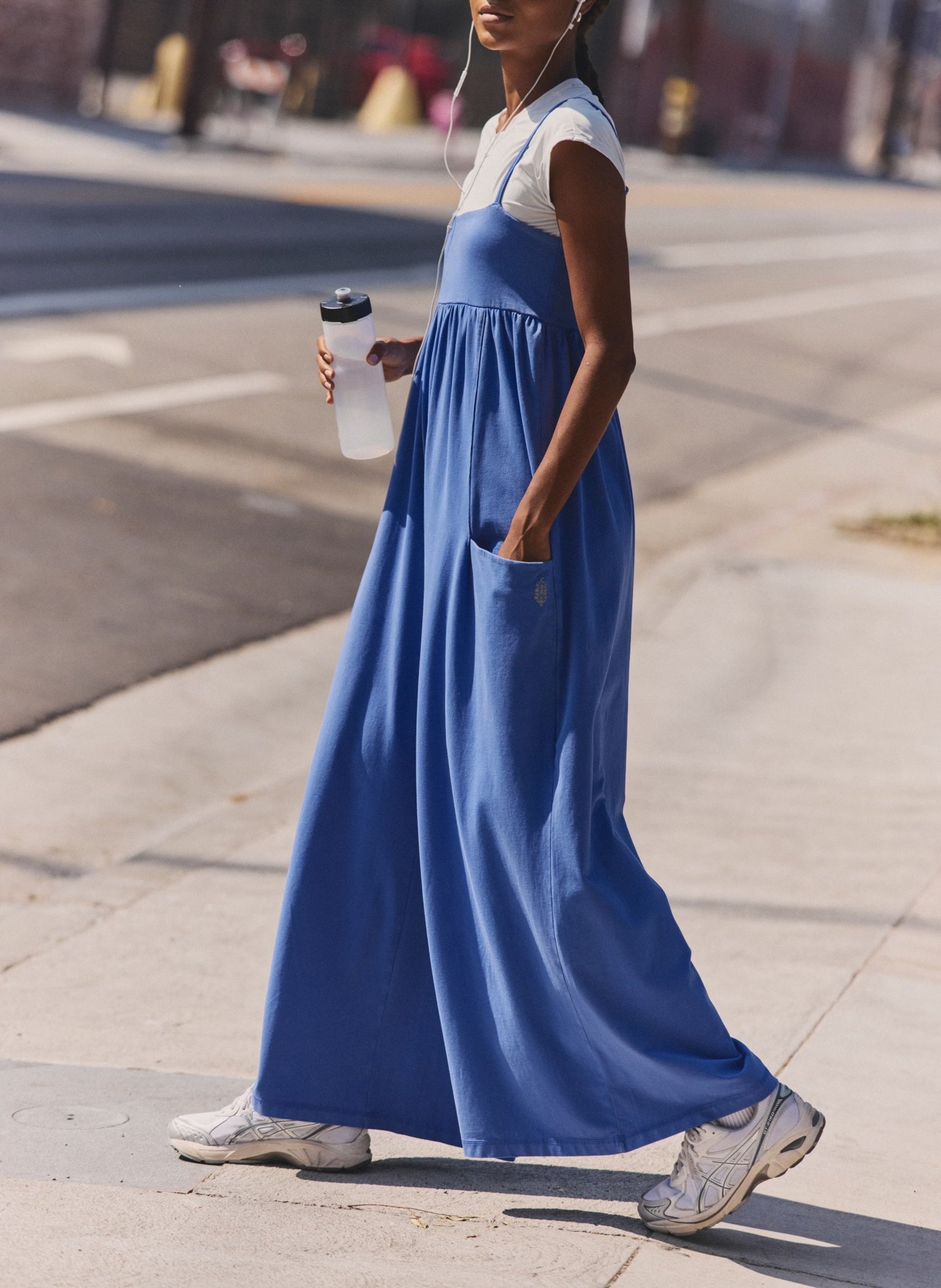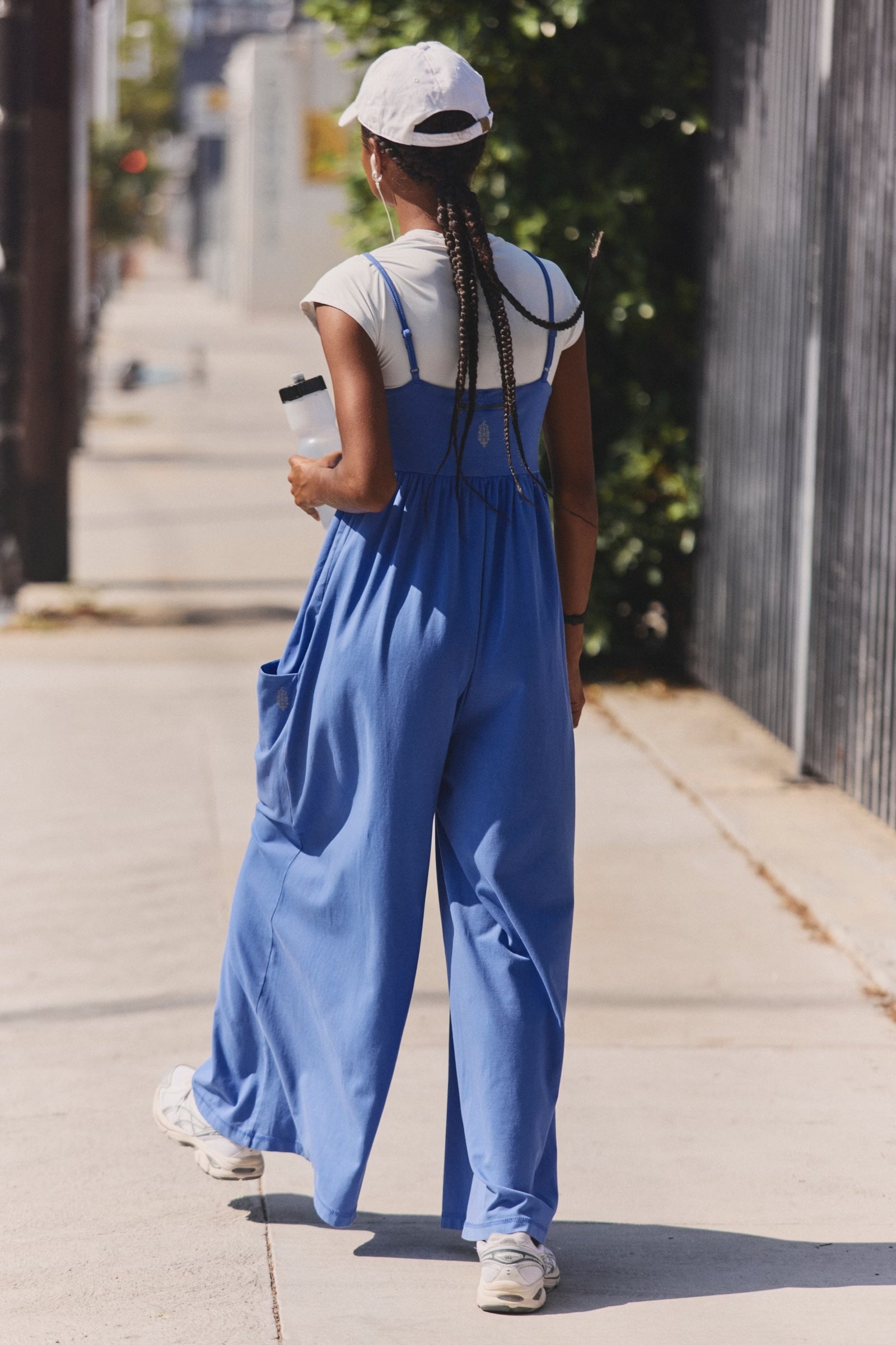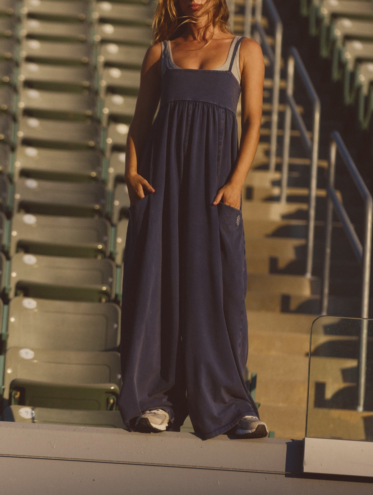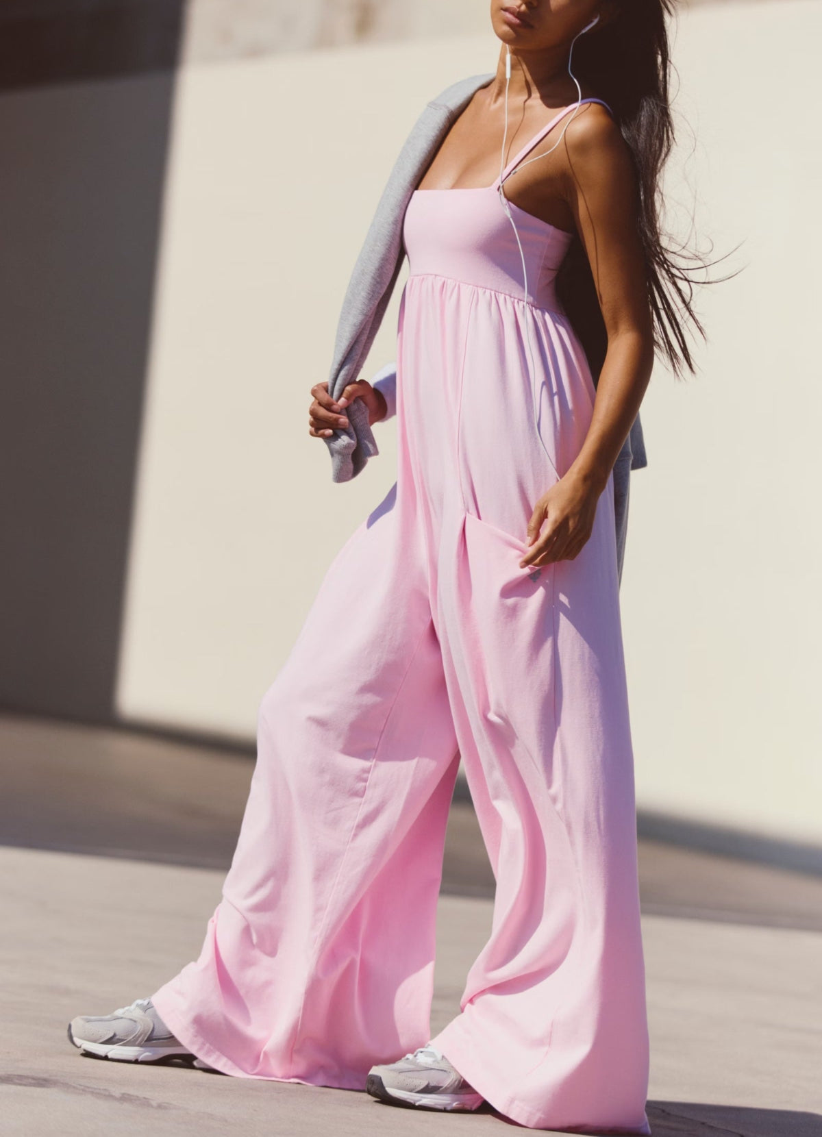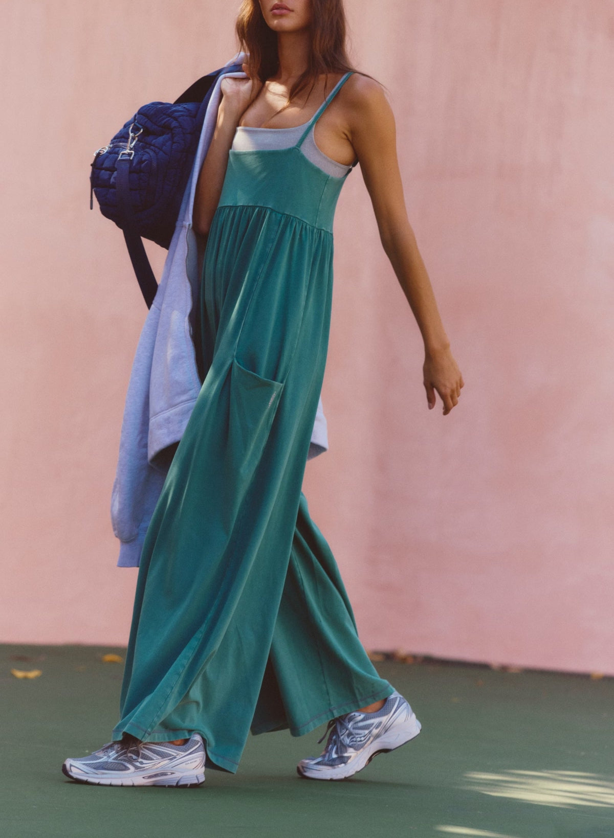 Features: Pull-on silhouette; slightly fitted, square-neck bodice; adjustable, spaghetti-style straps; pleated detailing at empire waist; slouchy patch pockets; oversized, wide legs; zipped logo pocket at back.