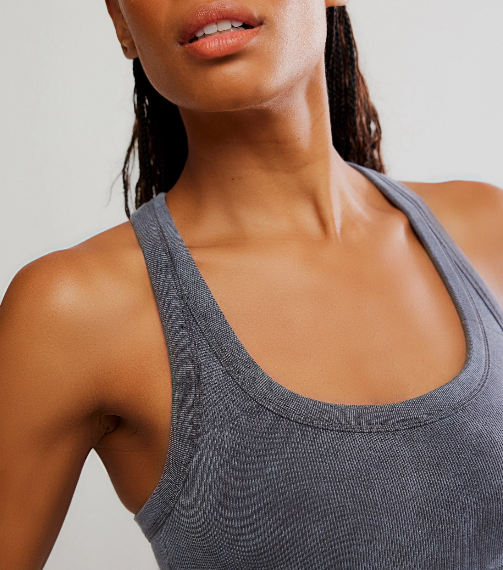 Features: Soft, ribbed knit fabrication; stretchy feel, scoop neckline, racerback-style, wide underbust band; low-impact design