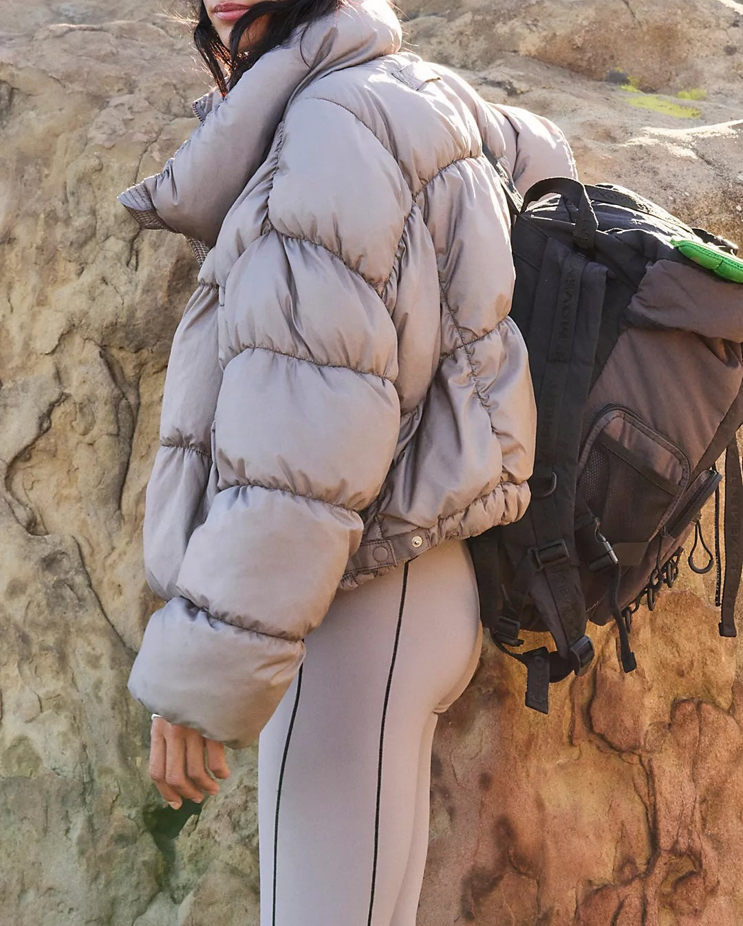 Features: Boxy, cropped silhouette, high collar, water-resistant, durable ripstop fabric; recycled PrimaLoft Thermoplume fill; fleece lined zipper hand pockets, interior chest pocket
