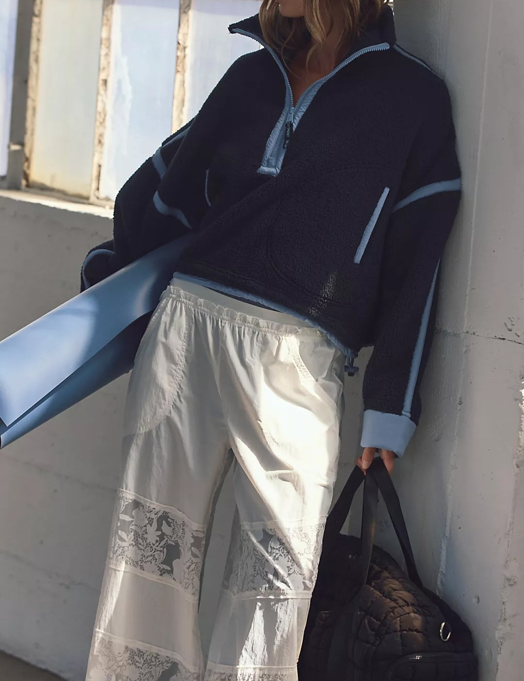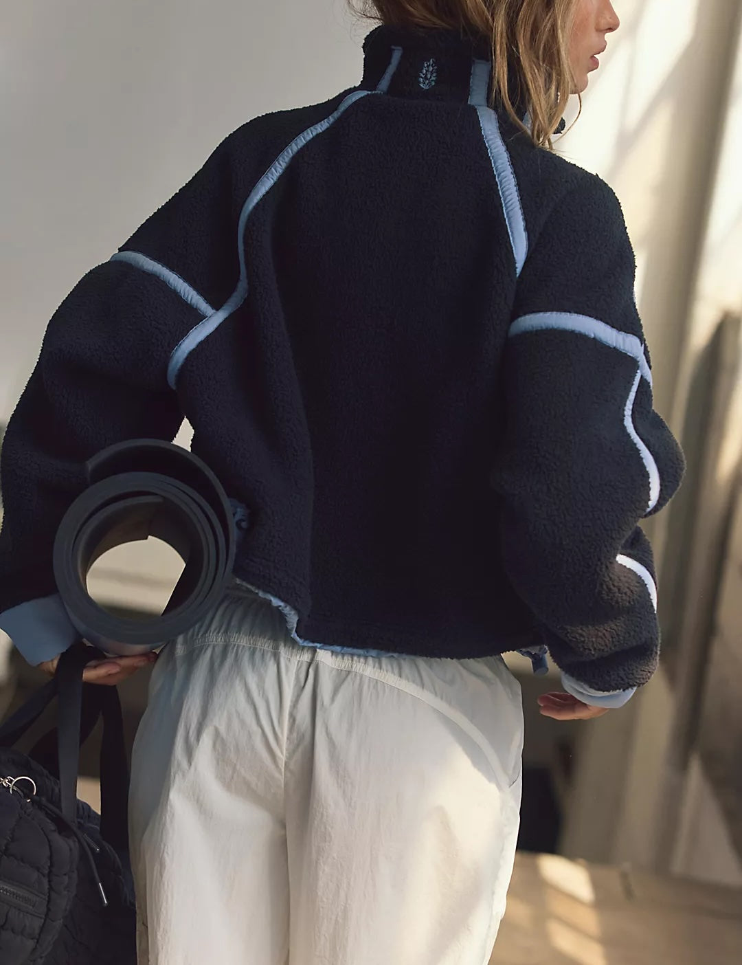 Cozy fleece pullover featuring a half-zip closure and high neckline with bold contrast seams throughout and an adjustable hemline.