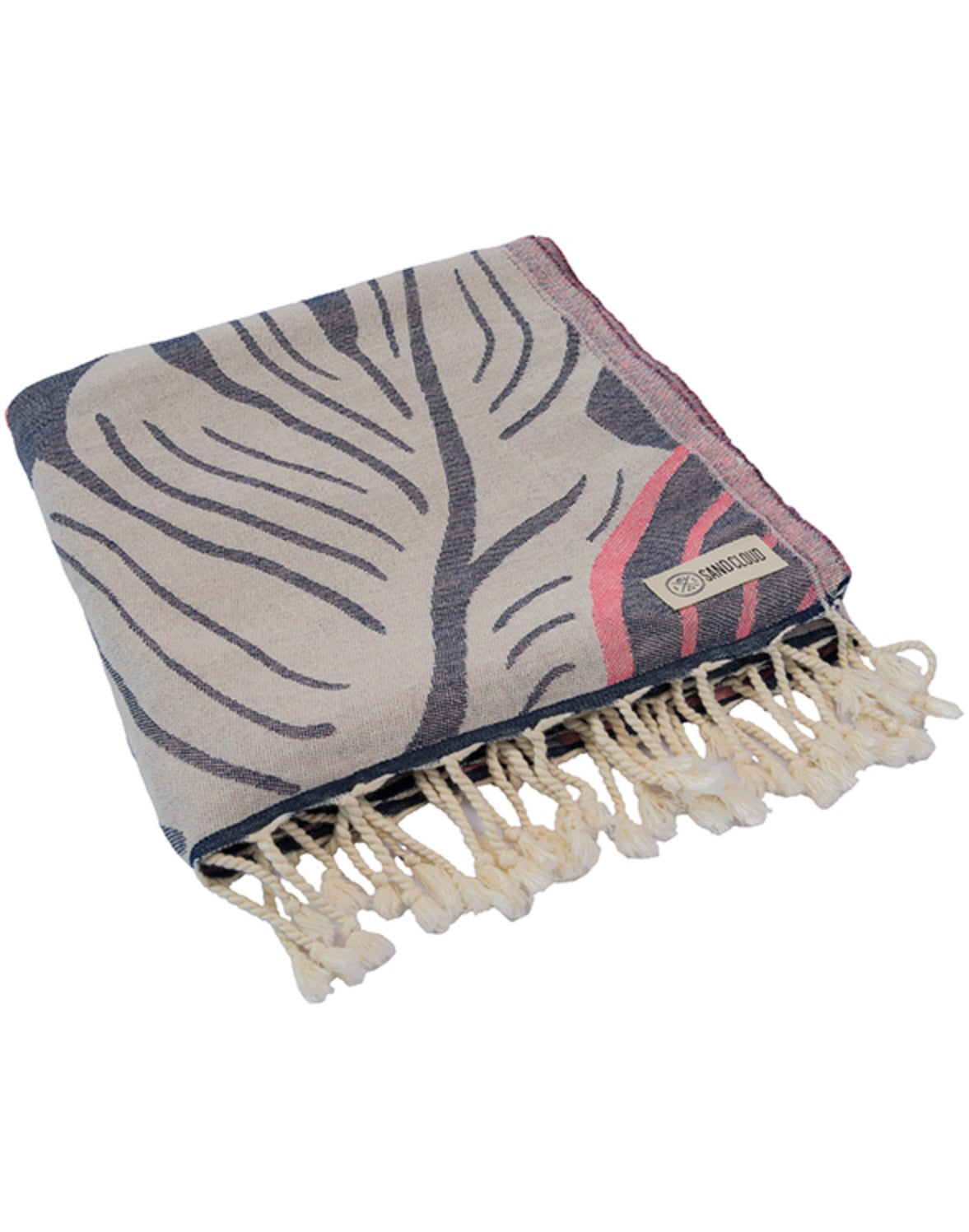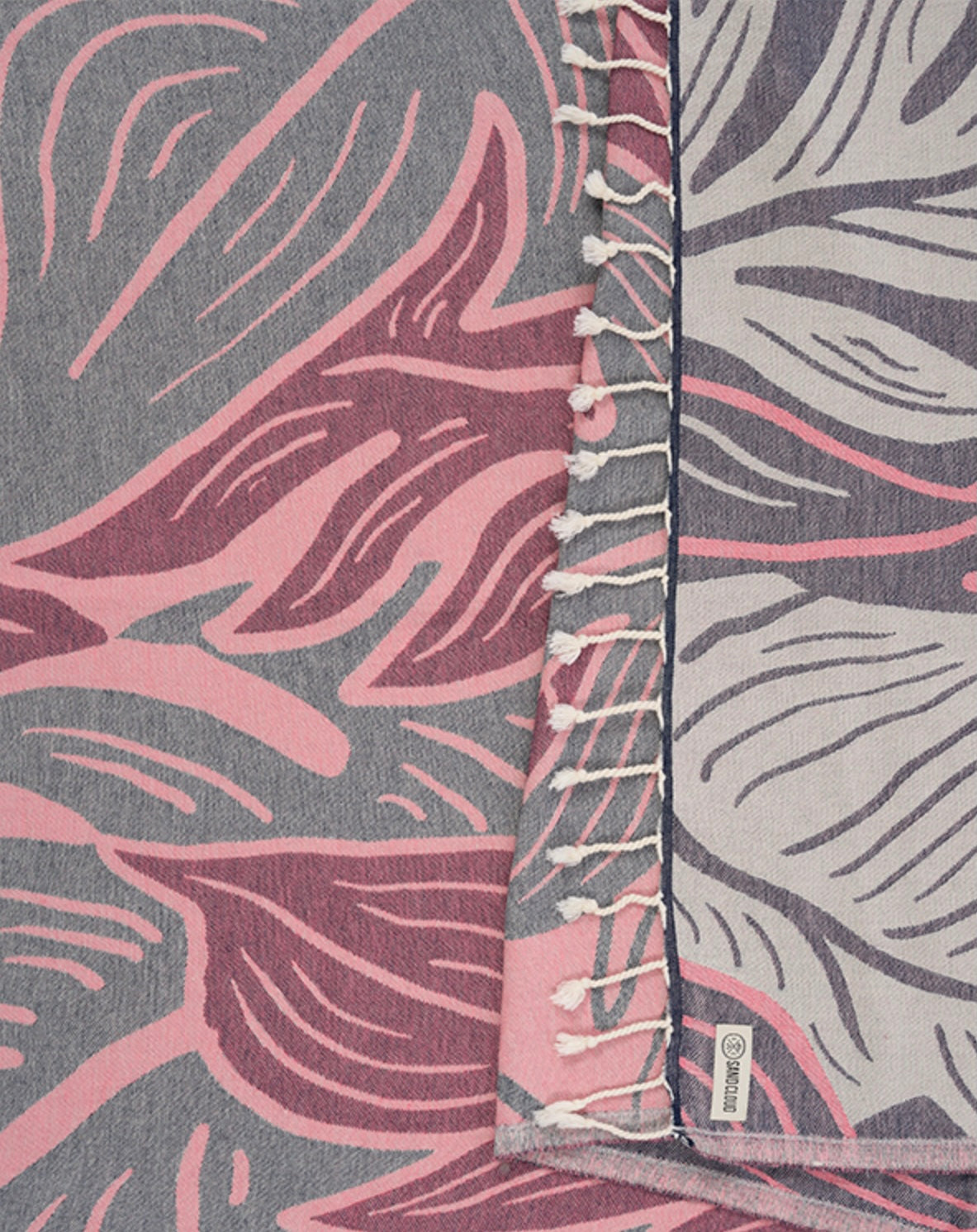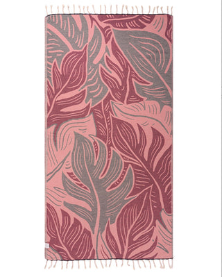 Leaves design, made from organic cotton for a softer hand feel and a better sustainable product, regular size, single jacquard weave, twisted tassels and sand resistant.
