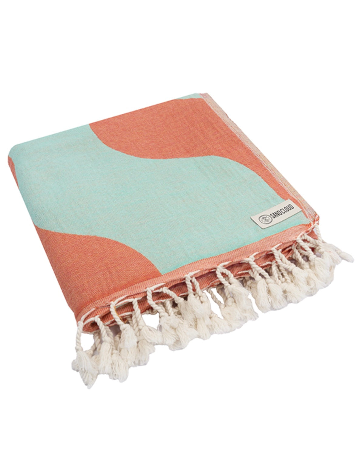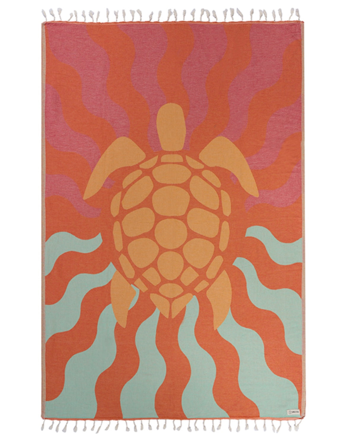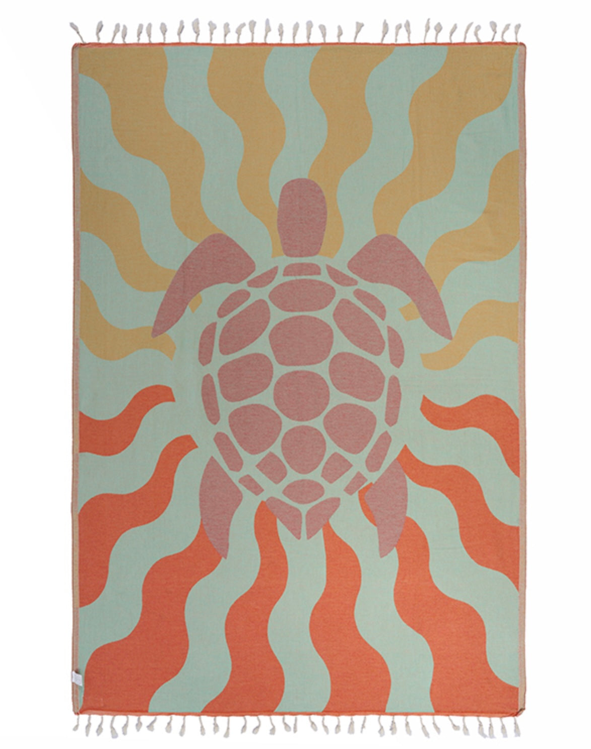 Sunset Turtle design, made from organic cotton for a softer hand feel and a better sustainable product, large size, single jacquard weave, fringe tassels and sand resistant.